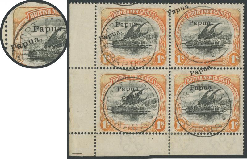 1907 Small 'Papua' Overprints Wmk Vertical 1/- black & orange with Overprint Double One Diagonally SG 44ba corner block of 4 from