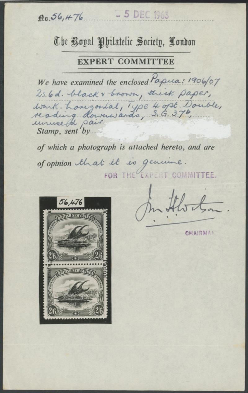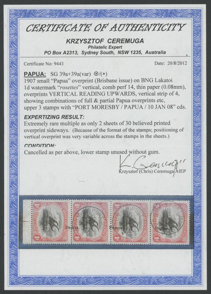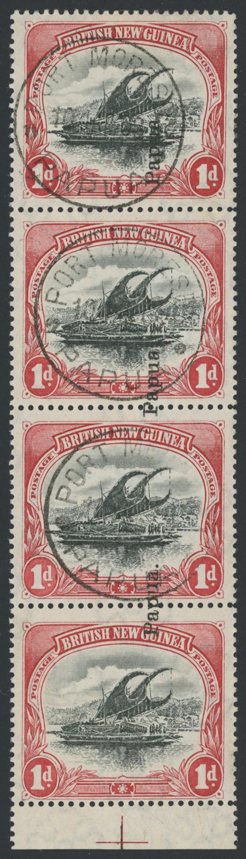 Upwards) SG 39a vertical strip of 4 from the base of the sheet, the upper three units CTO with Port Moresby cds of '10JAN08' and the base unit unused, gum removed, Cat £21,500+ for singles. The equal-largest recorded multiple of this marvellous