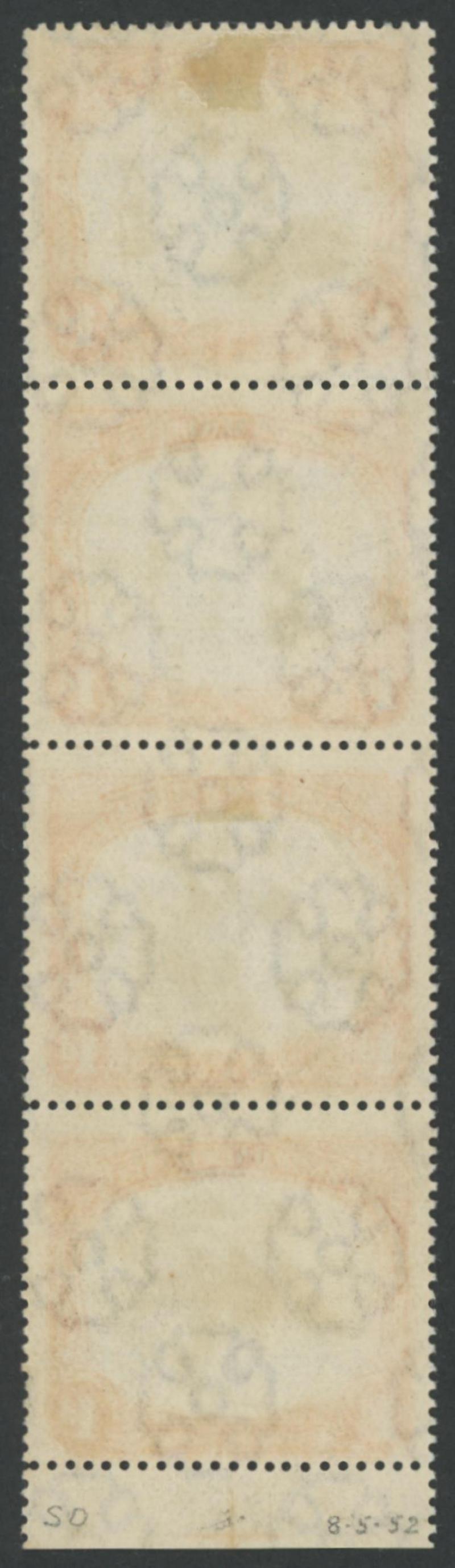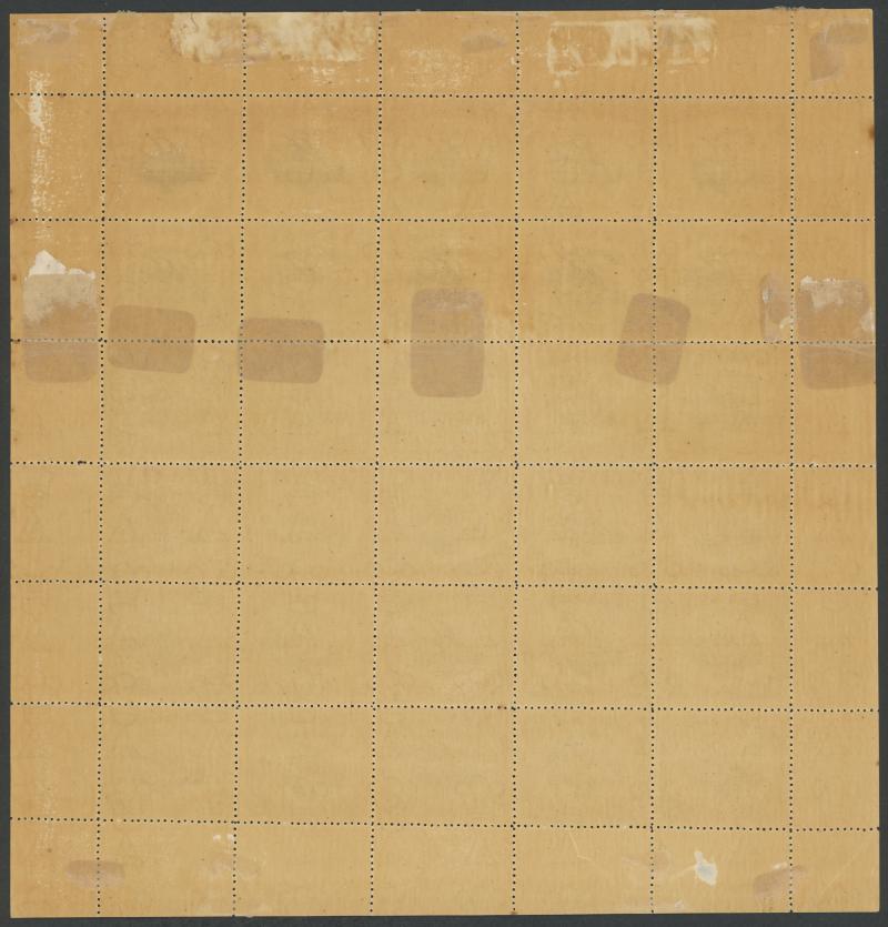 Two sheets of 30 were affected. Hamilton Croaker cites a description of a complete sheet as having 16 of 30 units with a complete overprint - as is the case here for the upper unit. On the pattern evident here, only 15 units would have a complete