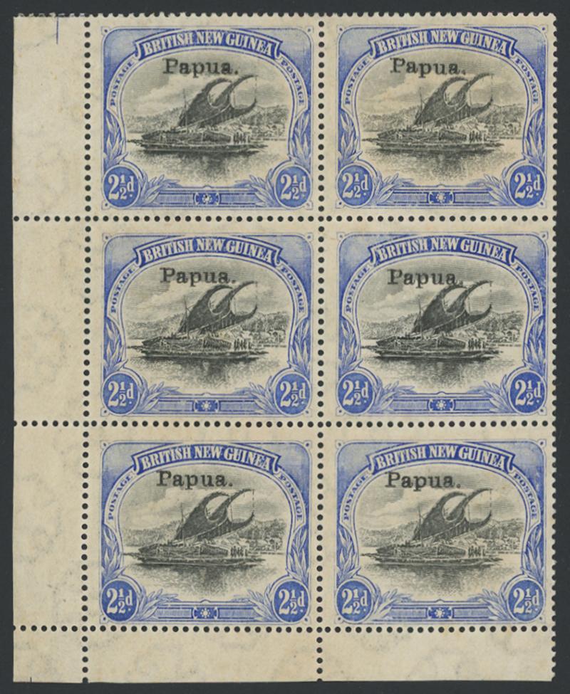 1907 Small 'Papua.' Overprints Watermark Vertical 2½d black & ultramarine SG 41 lower-left corner block of 6 [16-17/21-22/26-27],