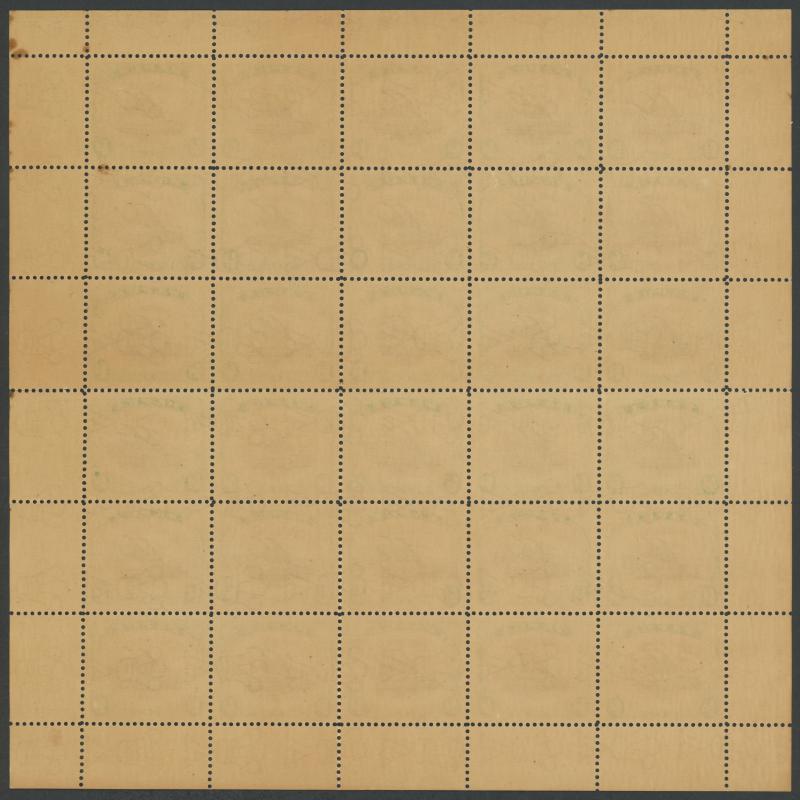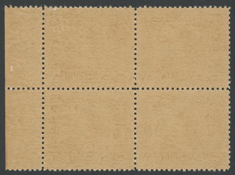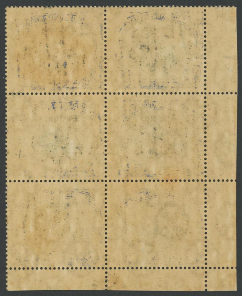 30 was affected. This is believed to be the largest multiple known of this error, and the upper unit unique in that it is the only one to show parts of four separate impressions of the overprint. (Image1) (Image2)