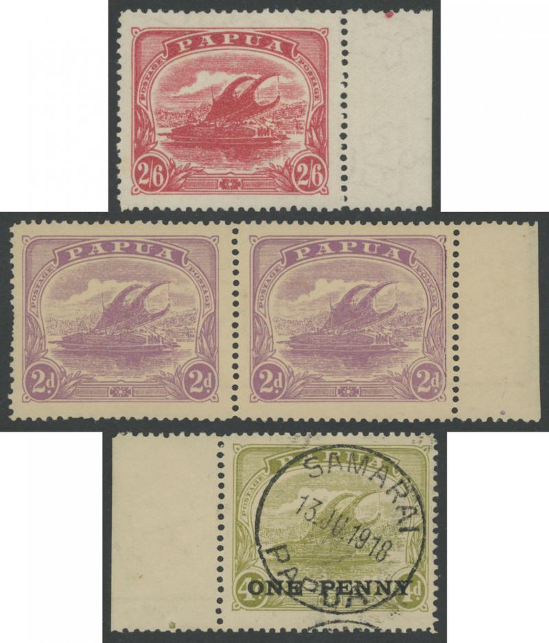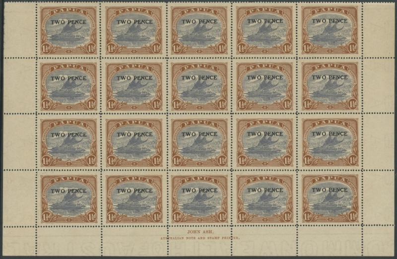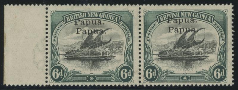 SG 43a marginal horizontal pair from the left-hand side of the sheet, both overprints on the left-hand unit with Inverted 'd' for second 'p' in 'Papua' [Pos 21] and on the right-hand unit with Dropped 'pua' [Pos 22], very fresh, lightly mounted, Cat