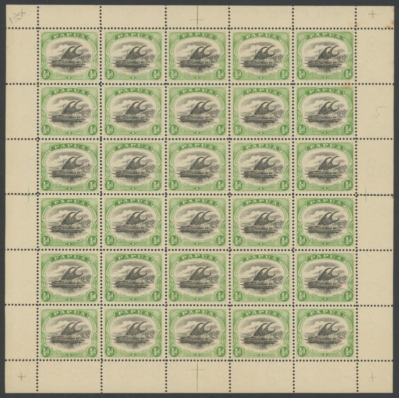 1907 Small 'Papua.' Overprints Rosettes Watermark Vertical Thin Paper Comb Perf 14 ½d black & yellow-green SG 38 complete sheet of