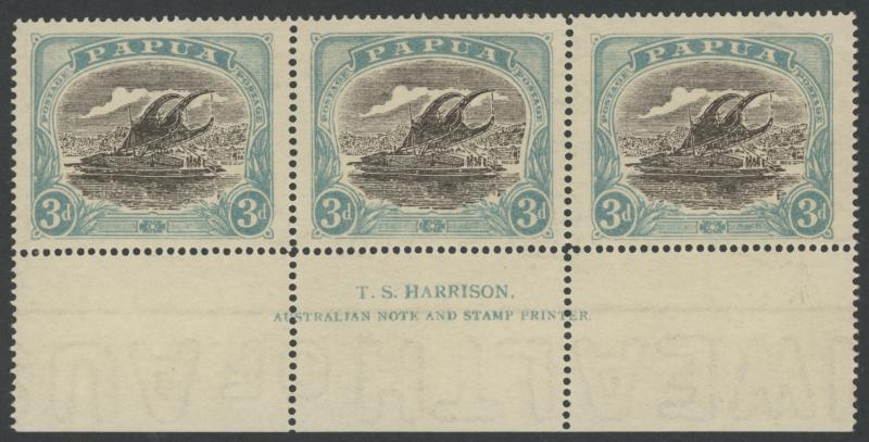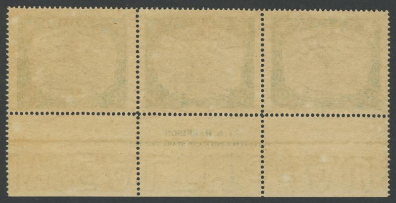 1916-31 Bicolours 3d sepia-black & bright blue-green SG 98b TS Harrison Imprint horizontal strip of 3 from the base of the sheet, a