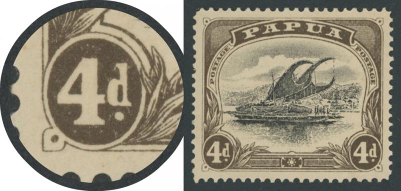 1907-10 Small 'PAPUA' Lithographs Crown/Double-Lined 'A' Watermark Upright (inverted) Perf 12½ 4d black & sepia with Deformed 'd'