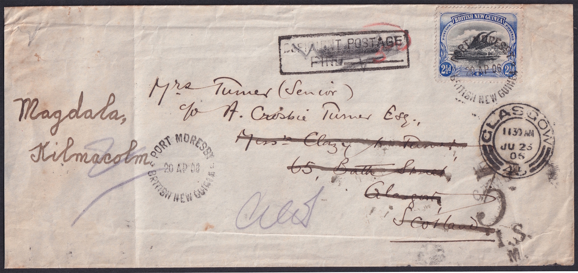 1906 (Apr 20) London Missionary Society cover (embossing on the flap) to Scotland with BNG 2½d only tied by very fine Port Moresby