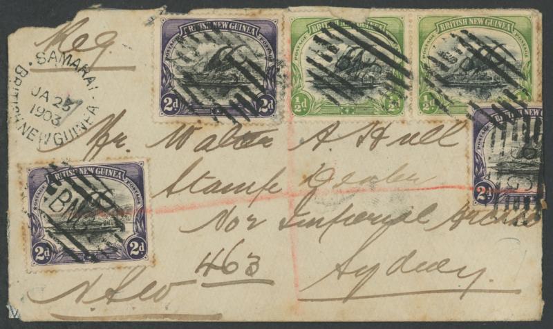 by 'SAMARAI ED/26JAN10/PAPUA' cds, vertical fold clear of the stamps & minor blemishes. Roger Lee states at page 14 that until 31.10.1912, the internal letter rate was 2d per half-ounce, meaning this article weighed between 3 & 3½oz. This is one of