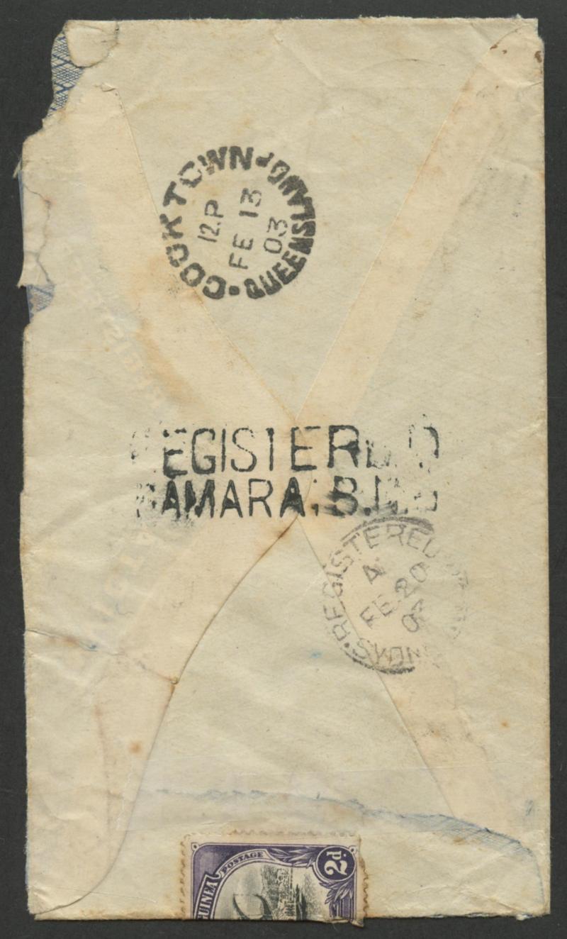 by very fine 9-bar 'BNG' cancels, very fine 24mm 'SAMARAI/BRITISH NEW GUINEA' cds alongside & largely very fine 'REGISTERED/SAMARAI BNG' (Lee #26; rated D) on the reverse, Cooktown (FE13) transit & Sydney (FE20) arrival backstamps, a few faults but