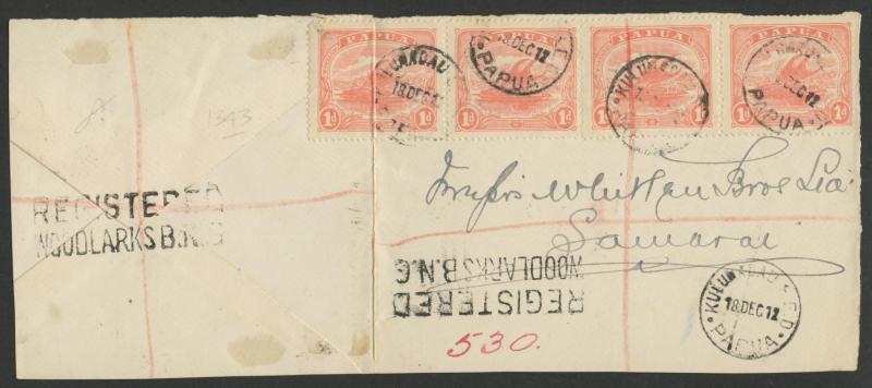 + 3d registration tied by 'KULUMADAU SED/18DEC12/PAPUA' cds, very fine 'REGISTERED/WOODLARKS BNG' handstamp (& a lesser strike on the reverse, opened-out & part of the back panel removed. Kulumadau (2) replaced Bonagai late-1907 & continued using the