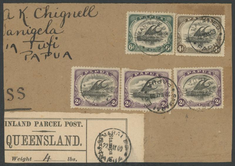 ED' cds, part-'INLAND PARCEL POST/QUEENSLAND' endorsed "4" (pounds weight) with another strike of the cds, minor defects. A rare parcel item that proves use in Papua of Queensland Parcel Post labels. The sender was Rev Arthur Keith Chignell, from the