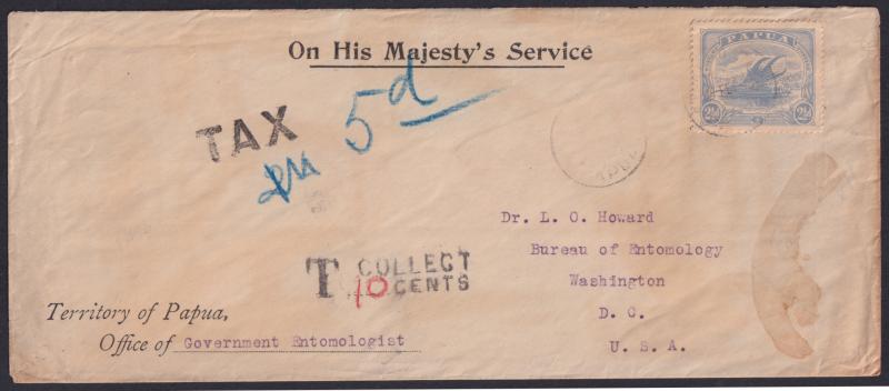 tied by poor Port Moresby cds, overweight with superb 'TAX ("5d")' (Lee #102A; rated D) & American 'T COLLECT/("10") CENTS' handstamps, light staining. Most covers with the 'TAX' markings are much later &/or overtly philatelic. The sender was George