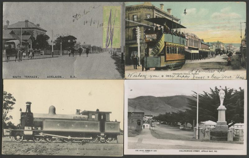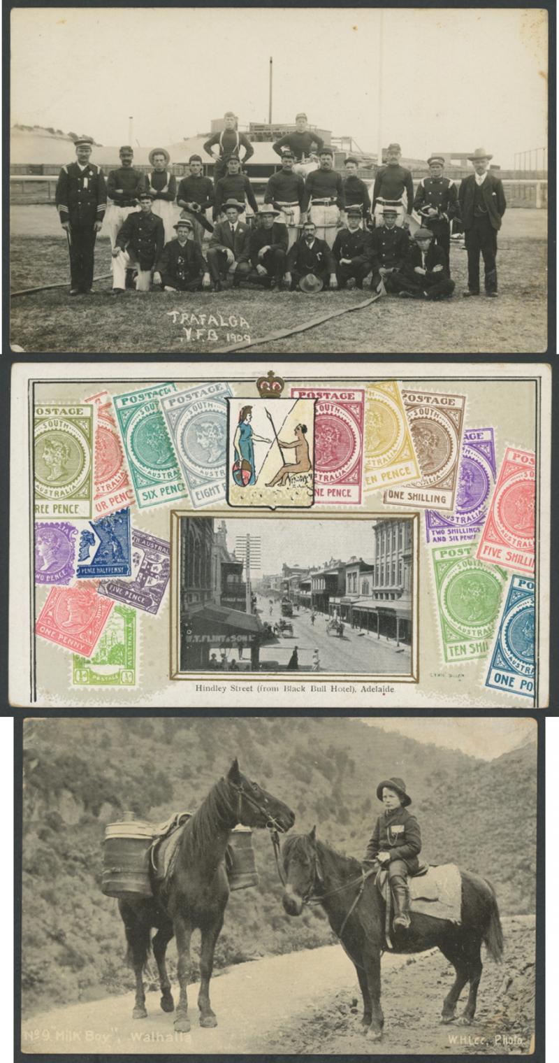 Rose views, Trams, good range from South Australia including VSM "stamps" cards with inset views of Adelaide x4, Western Australia WA 'Trafalga [sic] VFB 1909' (= Volunteer Fire Brigade), attractive Australiana, etc, WWI views & soldiers, novelty