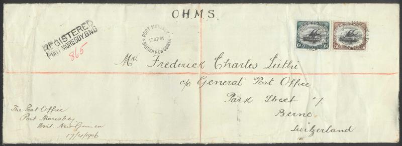 GUINEA' cds, 'REGISTERED/PORT MORESBY BNG' handstamp at upper-left, the reverse with Italian squared circles of Naples & MILANO-FERROVIA' and Swiss 'BERN/25.VI.06/BRF DISTR' arrival cds, unobtrusive central vertical fold & some creasing/wrinkling