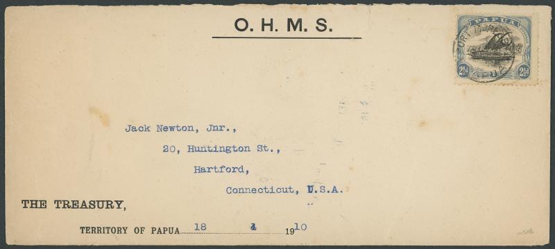 1918 (Nov 28) OHMS cover with Treasury imprint at lower-left to Connecticut with Litho 2½d tied by Port Moresby cds, light