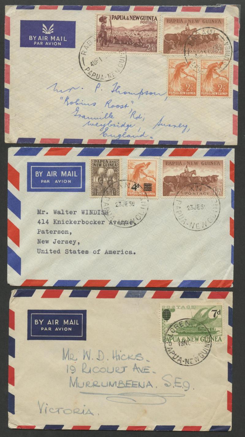 7d on 1/- on air cover to Victoria, 1958 apparently commercial air to USA with 1d 4d & 1/7d Cattle, 1962 double-rate air to GB with 2½d pair 1/7d Cattle & 2/6d Herdsman, 1950s OHMS air to Egypt with Egyptian censor cachet, 1959 unsealed local cover