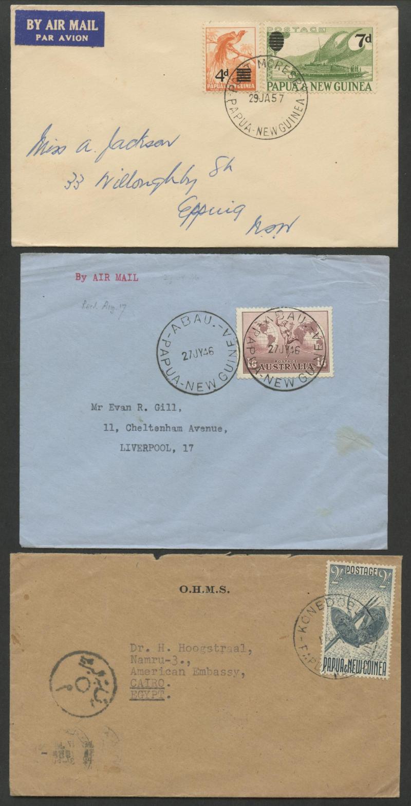 POSTAL HISTORY: Handy little group including 1946 air to Great Britain with 1/6d & 'ABAU' cds, 1957 Surcharges plain FDC (superb) &
