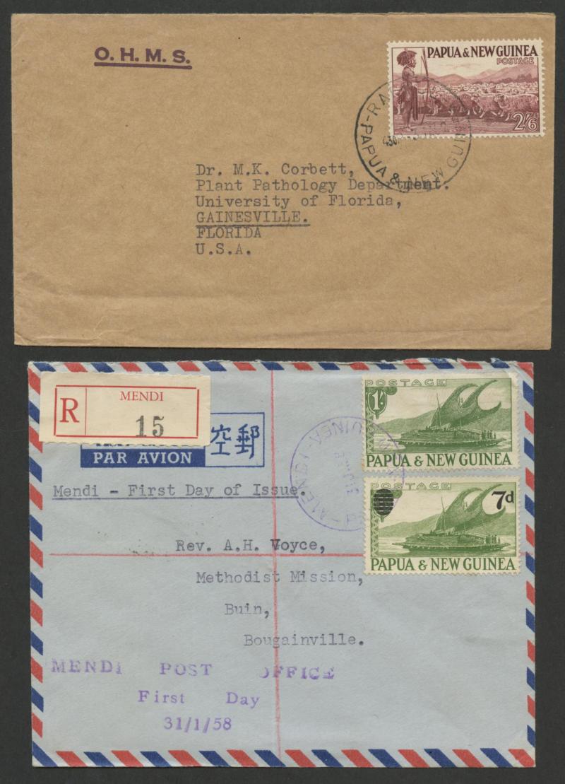 emergency-printing airmail labels, 1953 (3 March) KGVI Registration Envelope 1/0/½d combination franking uprated with PNG 1/- Lakatoi for "Comp 1/6" (Compensation) two days after the Australian stamps became invalid but accepted, also items from