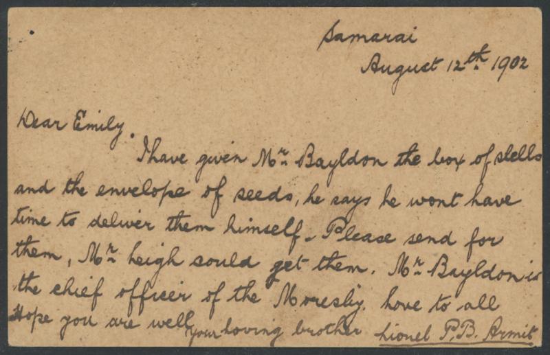 1902 (Aug 12) usage of British New Guinea Postal Card 1d red from with message headed "Samarai" & signed "Lionel PB Armit" to his