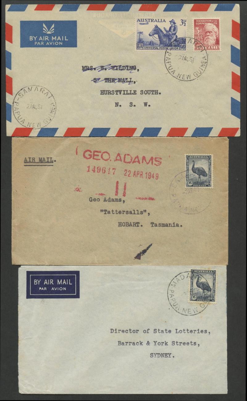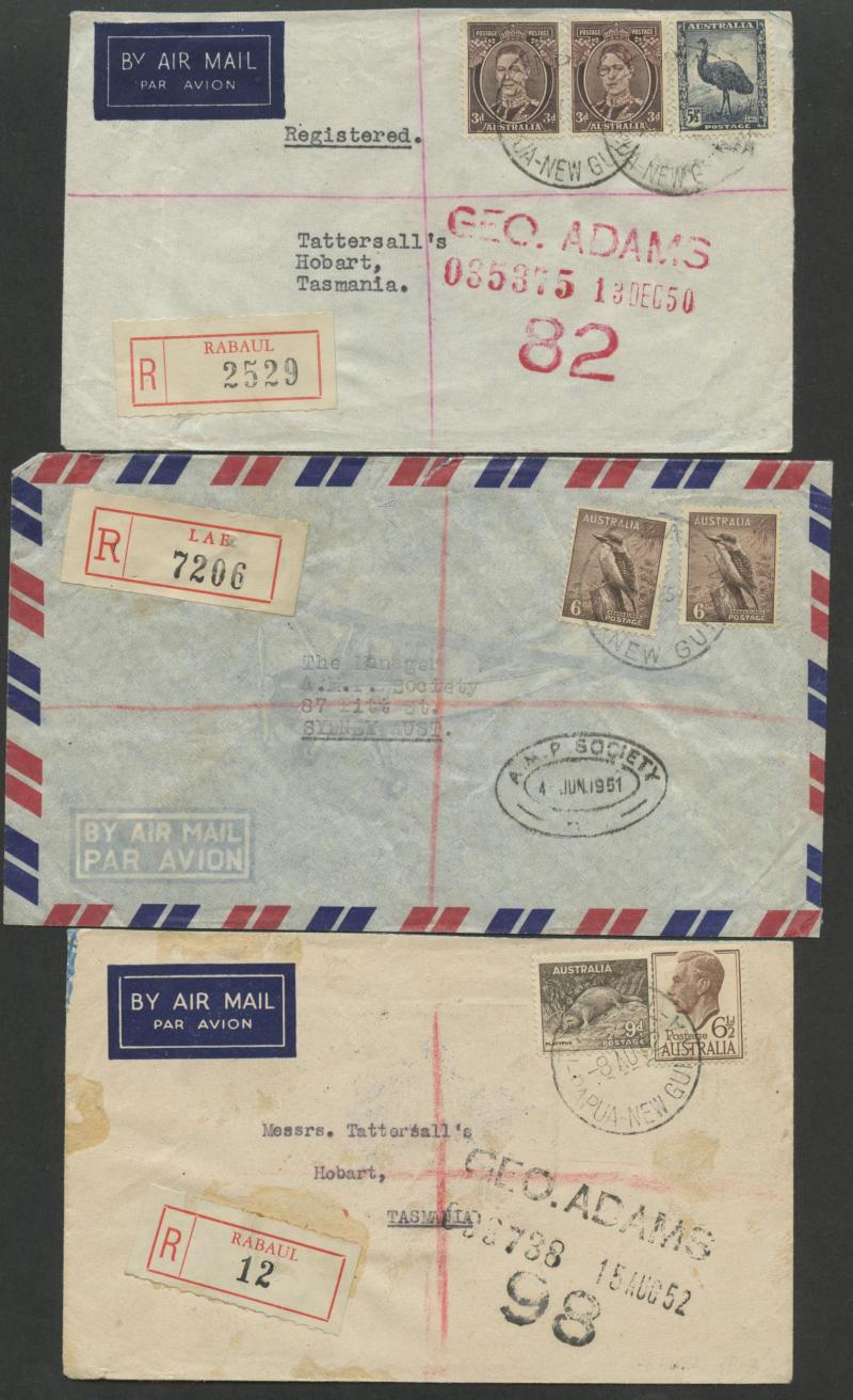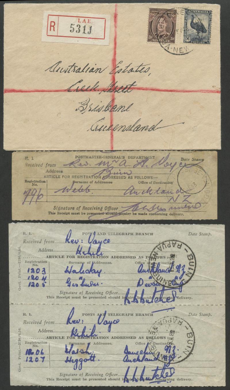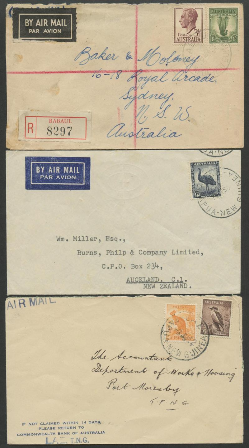 Moresby, 1948 to NZ with 'BUKA PASSAGE' cds & 'SOHANA' misspelled R label, 1949 from Sohano (cds misspelled 'SOHANA' but the R label spelled correctly) with scarce 'MONEY ORDER OFFICE/RABAUL' backstamp, 1952 registered x2 both with black/white