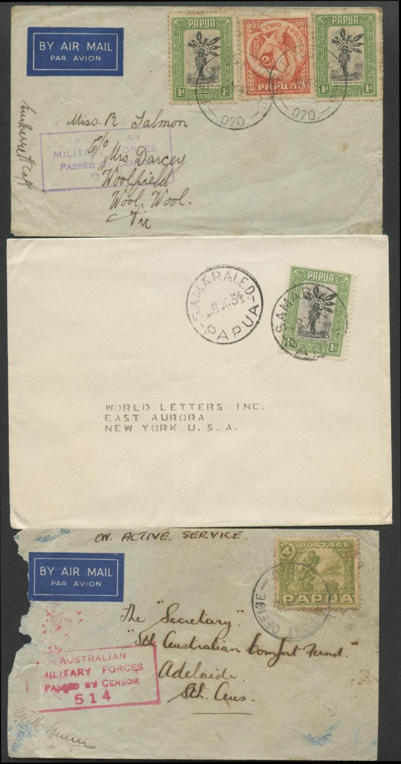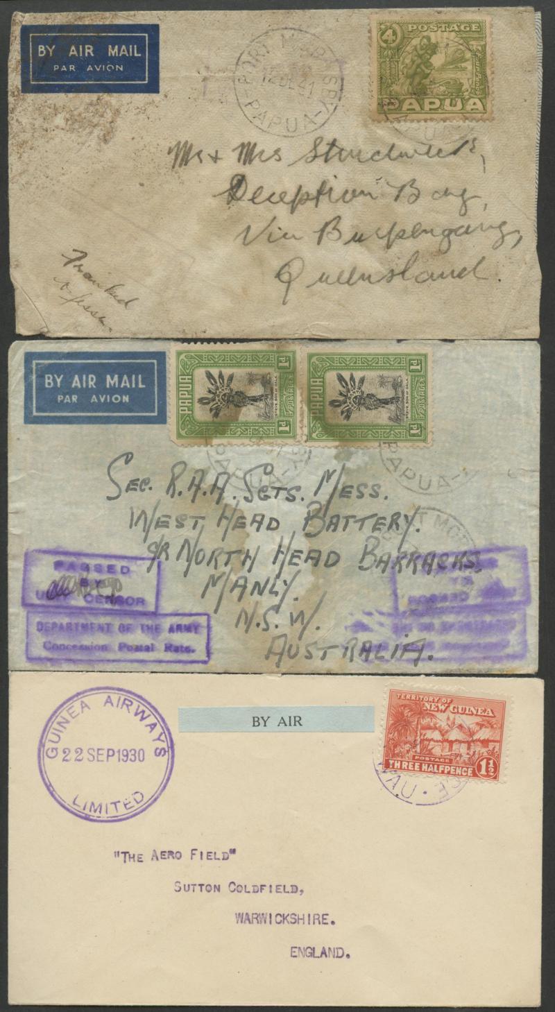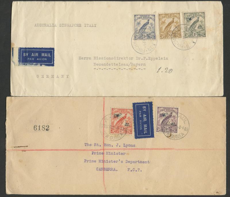 Rt Hon J Lyons Prime Minister/Canberra" with Dated Airs 2d & 9d, 1939 air to Germany with 3d & 6d and 'AIR/MAIL' 1/-, and Papua 1942 Pictorials 1d x2 & 2d tied by Australian 'FIELD POST OFFICE/020' cds used at Murray Barracks, etc, mostly fine to