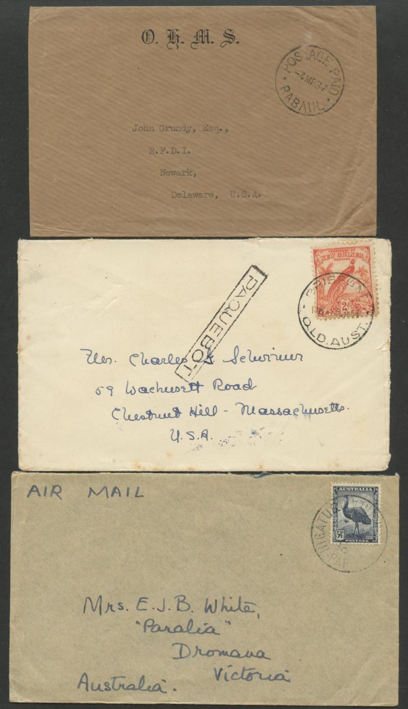 'KAVIENG' (cds in violet) & 'HIGATURU', other postmark interest, a couple of registration receipts, etc, plus New Guinea 1937 OHMS with 'POSTAGE PAID/RABAUL' cds, 1938 with 2d tied by Brisbane cds & 'PAQUEBOT' alongside, 1938 registered air to "The