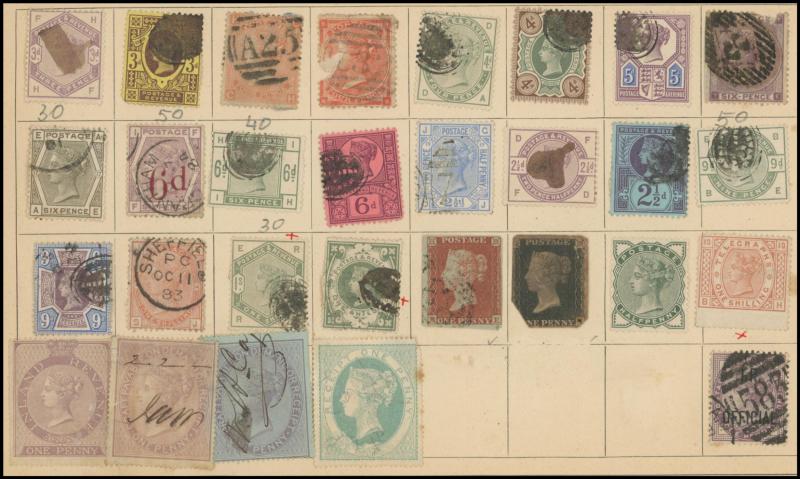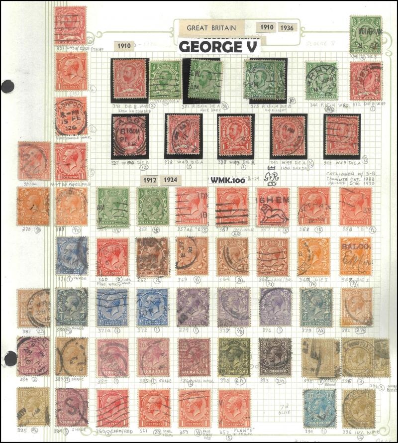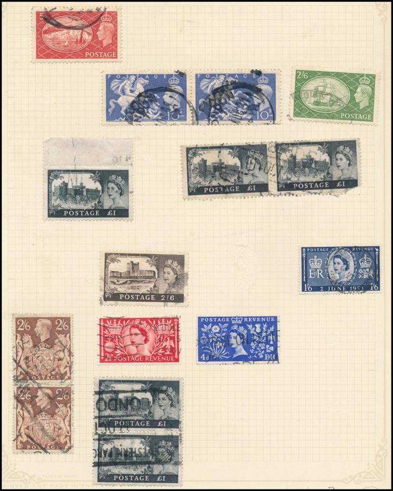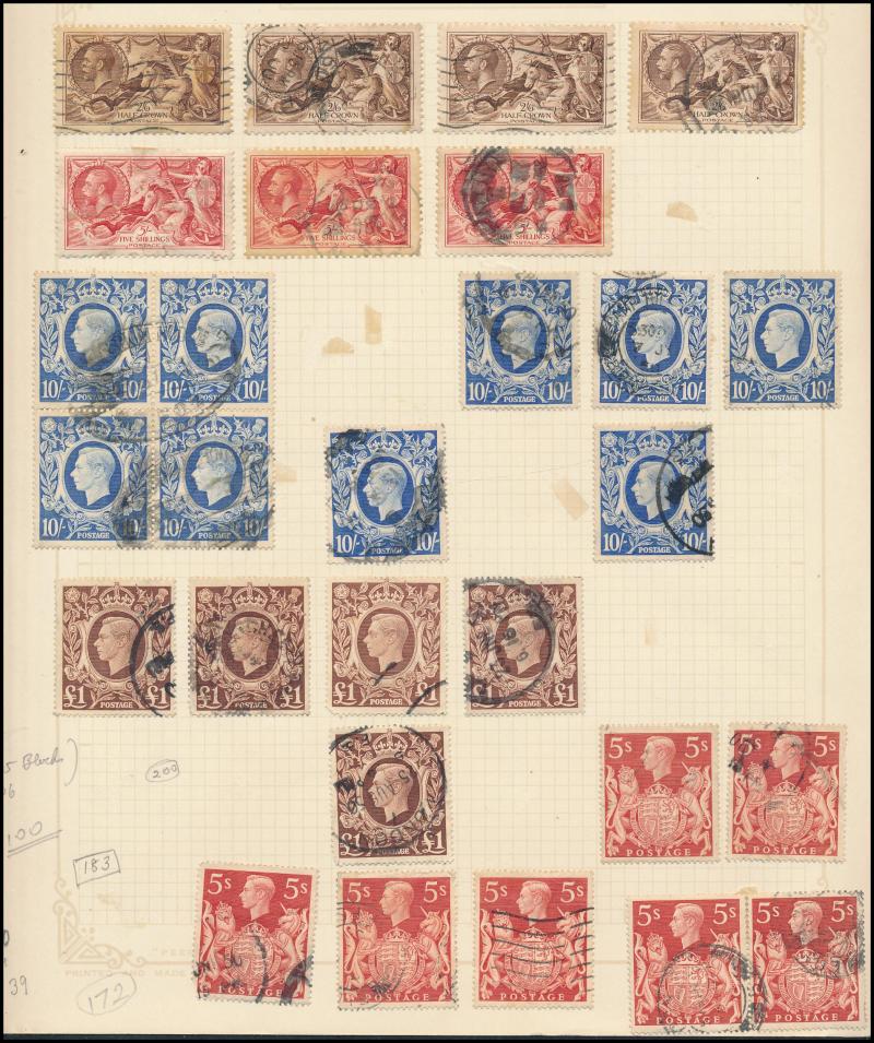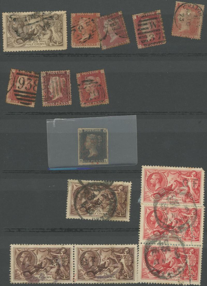 12 **, plus an old time album with GB including used QV Penny Black with 4 margins, lilac & green 9d original colour, and parcel piece with 1929 PUC defective £1 pair, Re-Engraved 10/- Seahorse pair, 5/- & 1/-, and some USA with PPCs, condition
