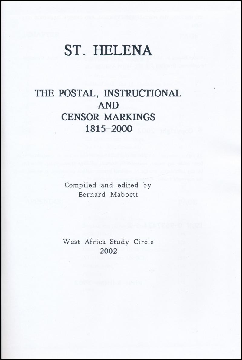 Helena Postal Markings 1815-2000' by B. Mabbett 176pp, h/b, 'St Helena: The Philately of the Anglo Boer War Years' 236pp, h/b, plus Gibbons 'St Helena & Dependencies'. Weighs 3kg.