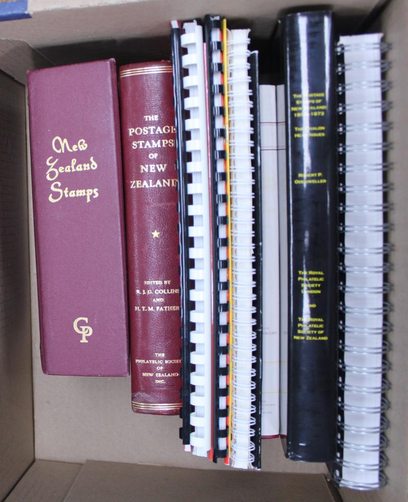 'The Postage Stamps of New Zealand: 1855-1873, The Chalon Head issues + Supplement', plus other titles. Weighs 11kg.