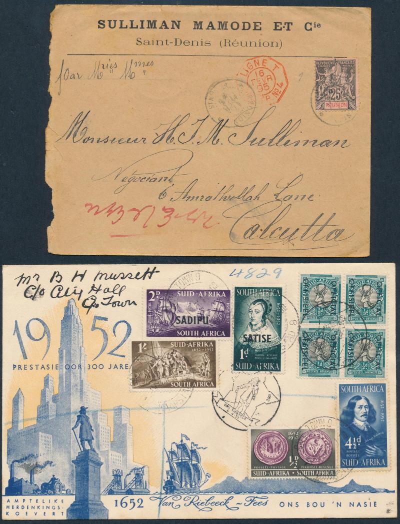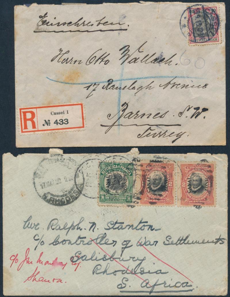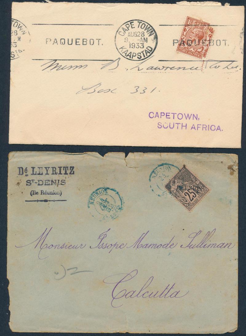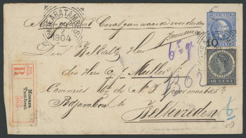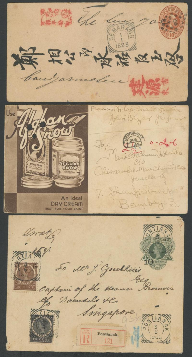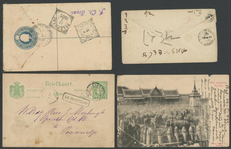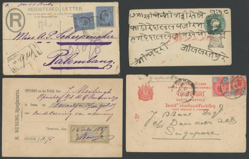 Chinese usage from 'SEMARANG' to 'BANDJARMSIN', registered from 'PONTIANAK' and 'MOEARATAMBESI'; Straits Settlements KEVII 10c Registration Envelope Singapore-Palembang; Thailand 1904 PPC ('Wild elephants/Ajutha') Bangkok-Singapore (small edge