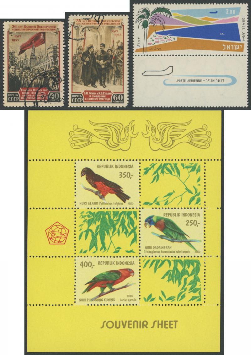 Elat with tabs; and Russia 1880s-1990s mint & used with imperfs, surcharges, M/Ss, noted 1953 Revolution, condition variable. Weighs 7kg.