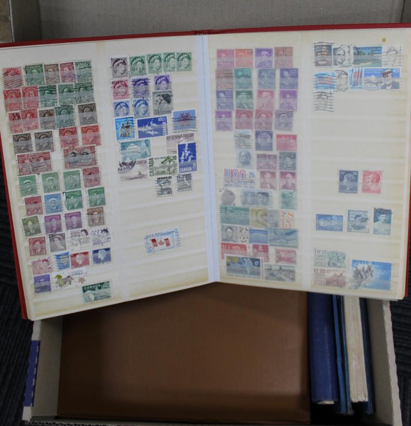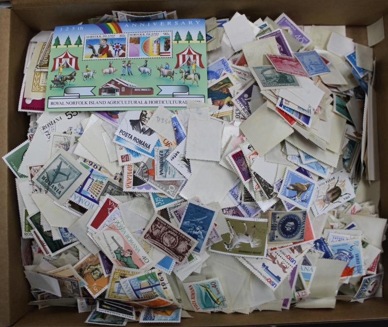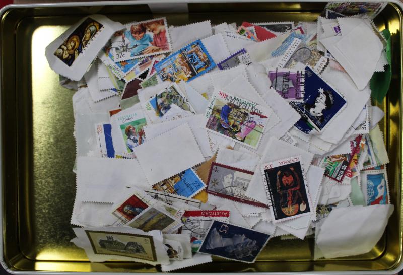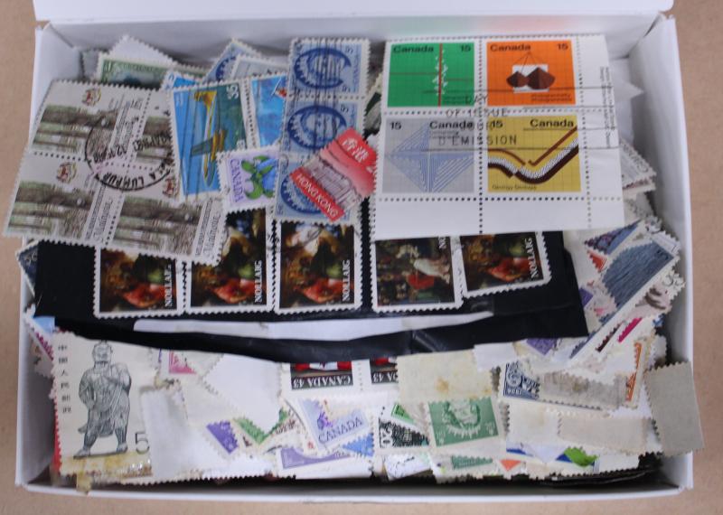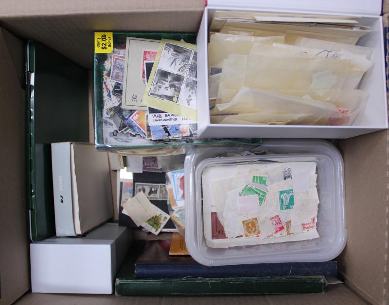 World in two cartons with mint and used off-paper and loose in tins & boxes includes Australia, Great Britain, New Zealand, Canada,