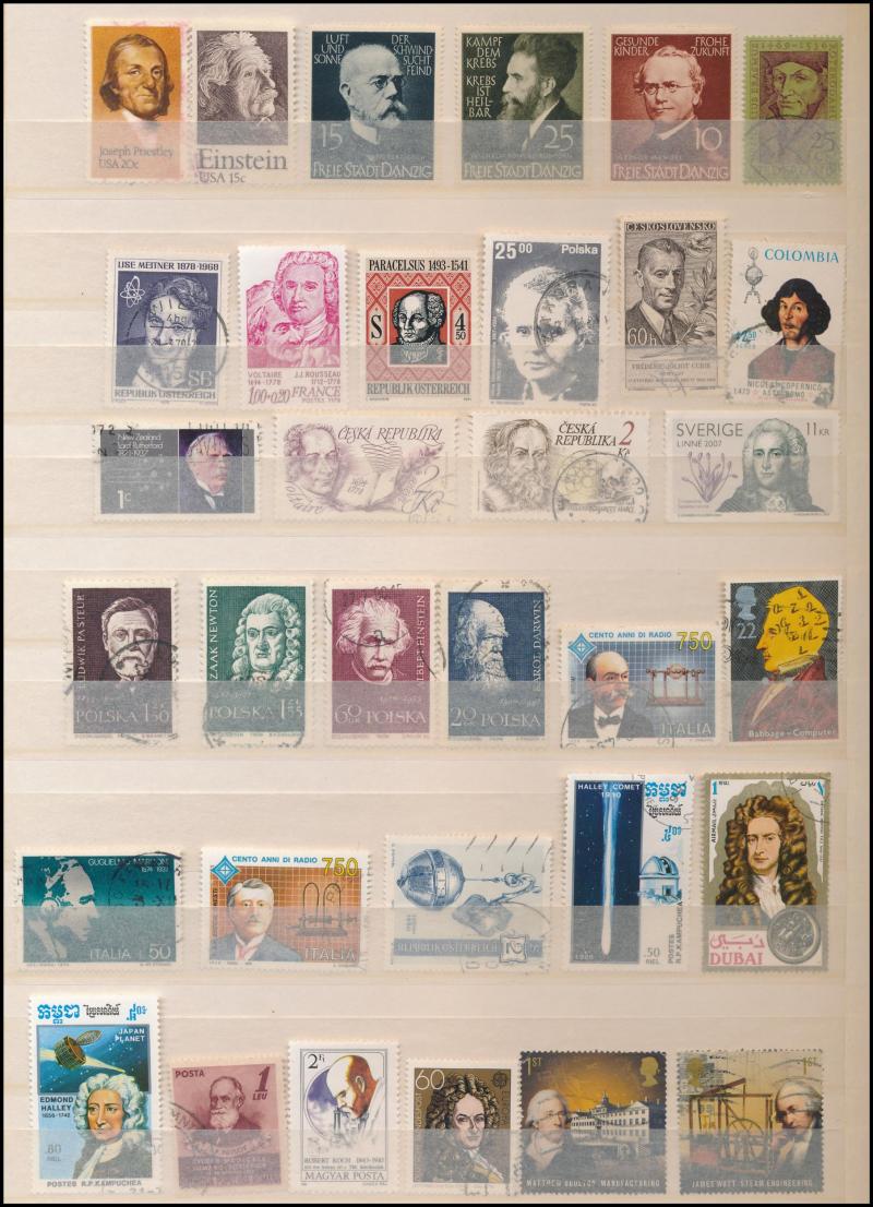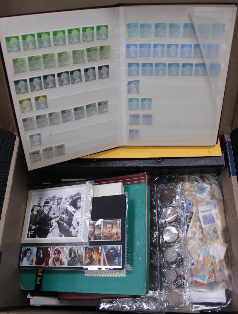 covers in two albums, shoebox of world FDCs, thematic collections including science, music, art, Olympics, plus Seven Seas 1990-2010 hingeless album page supplements; and some miscellaneous coins and medallions, condition variable. Weighs 35kg.