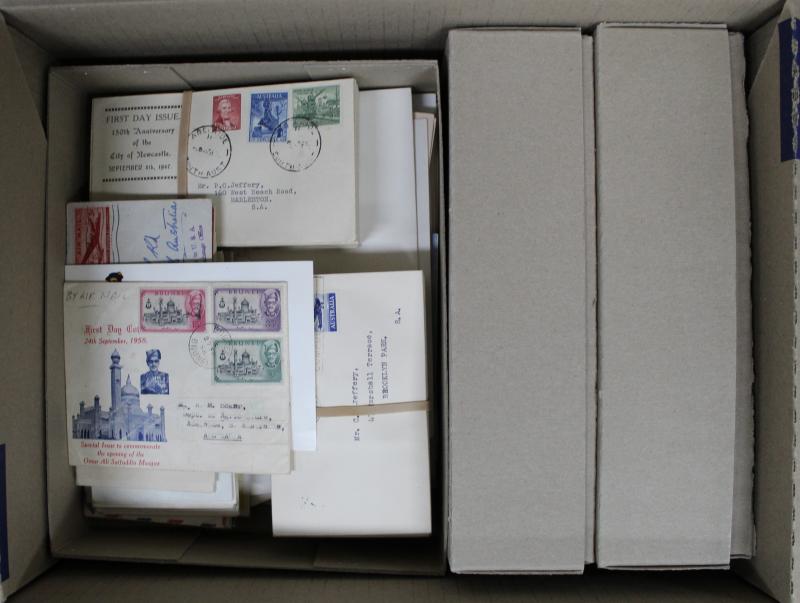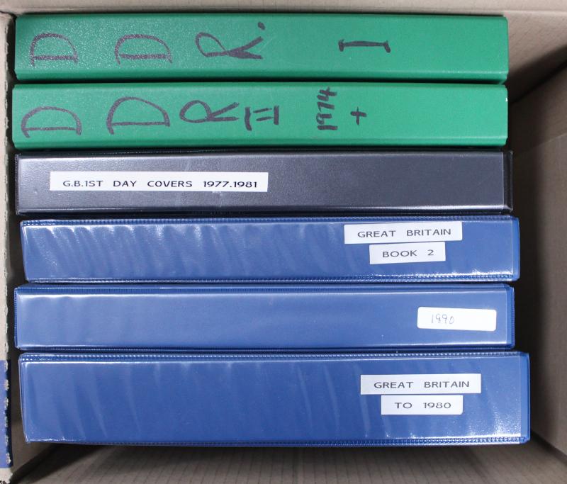 Carton containing shoebox with World 1970s-80s FDCs and commemorative covers strength in Great Britain; plus 1983 'The Commonwealth