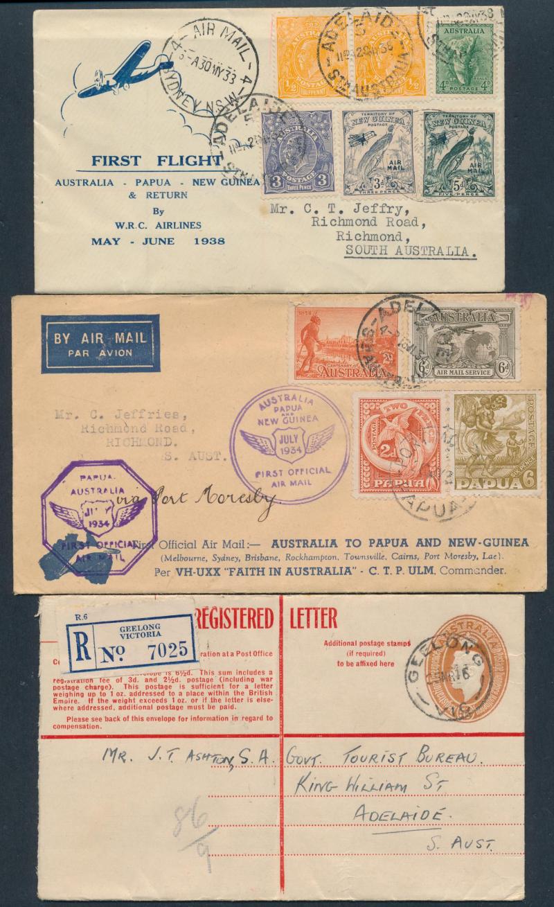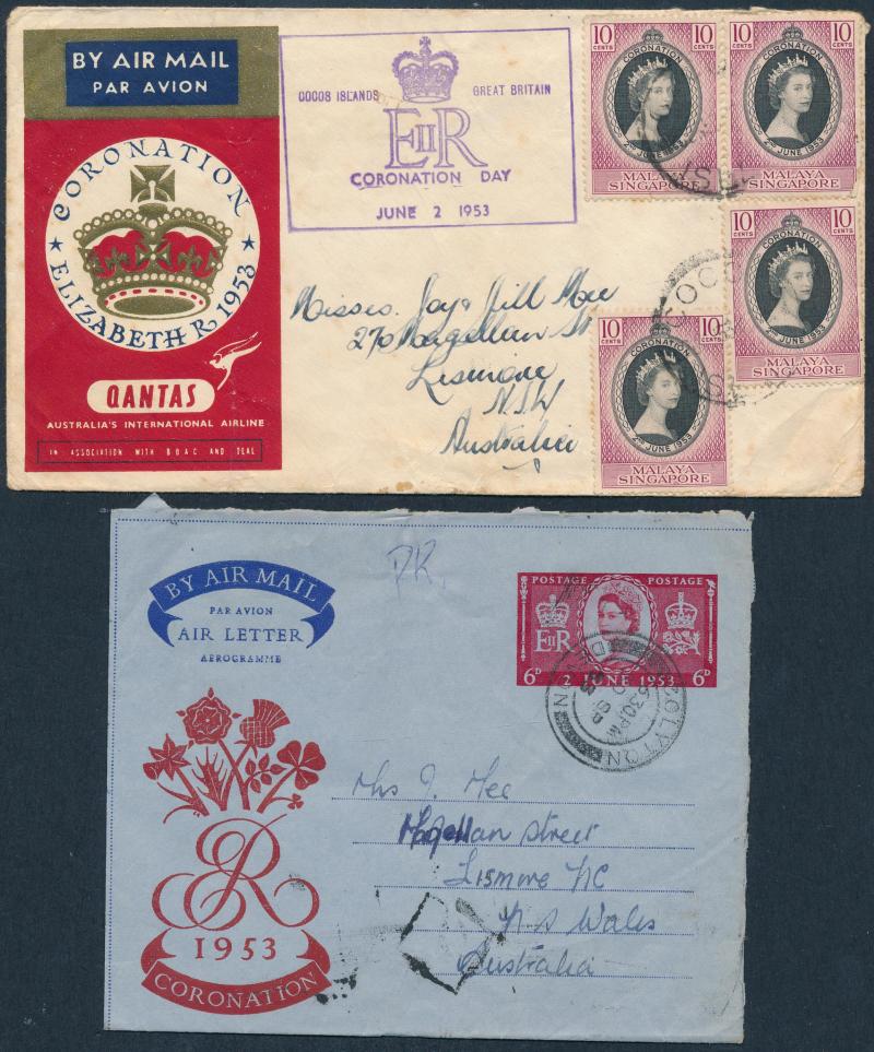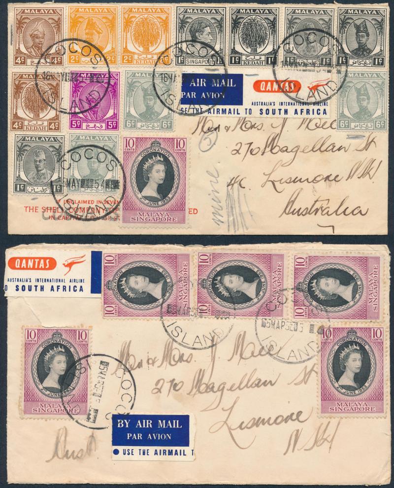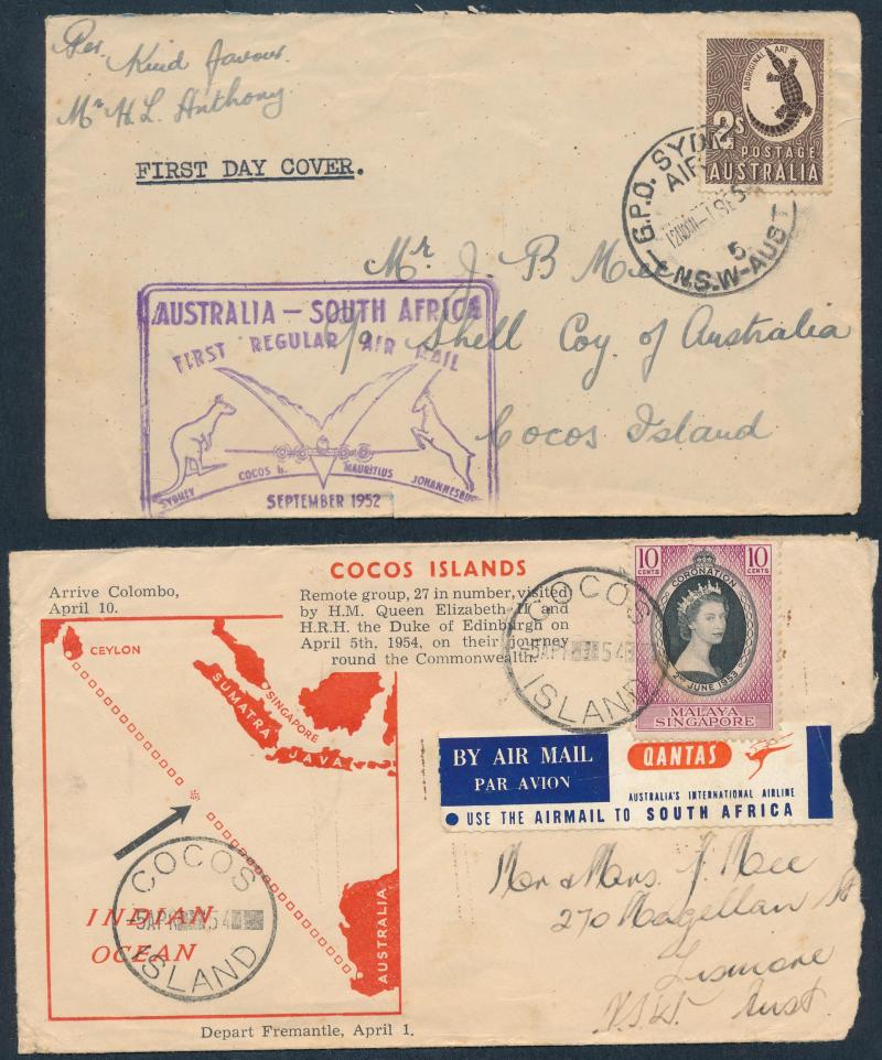 Box containing Cocos Islands 1953-54 philatelic covers to Australia, 1952 2/- Aboriginal Art FDC/Flight cover to Cocos, Post Office
