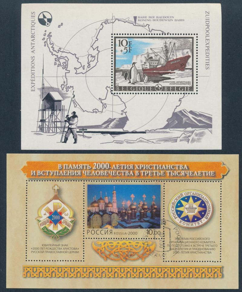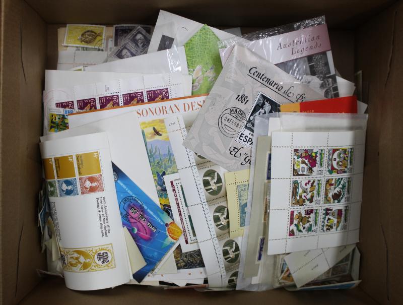 World miniature sheets in box with mint, postally used, and CTO; also box with sheetlets, blocks, singles, some on/off-piece, and