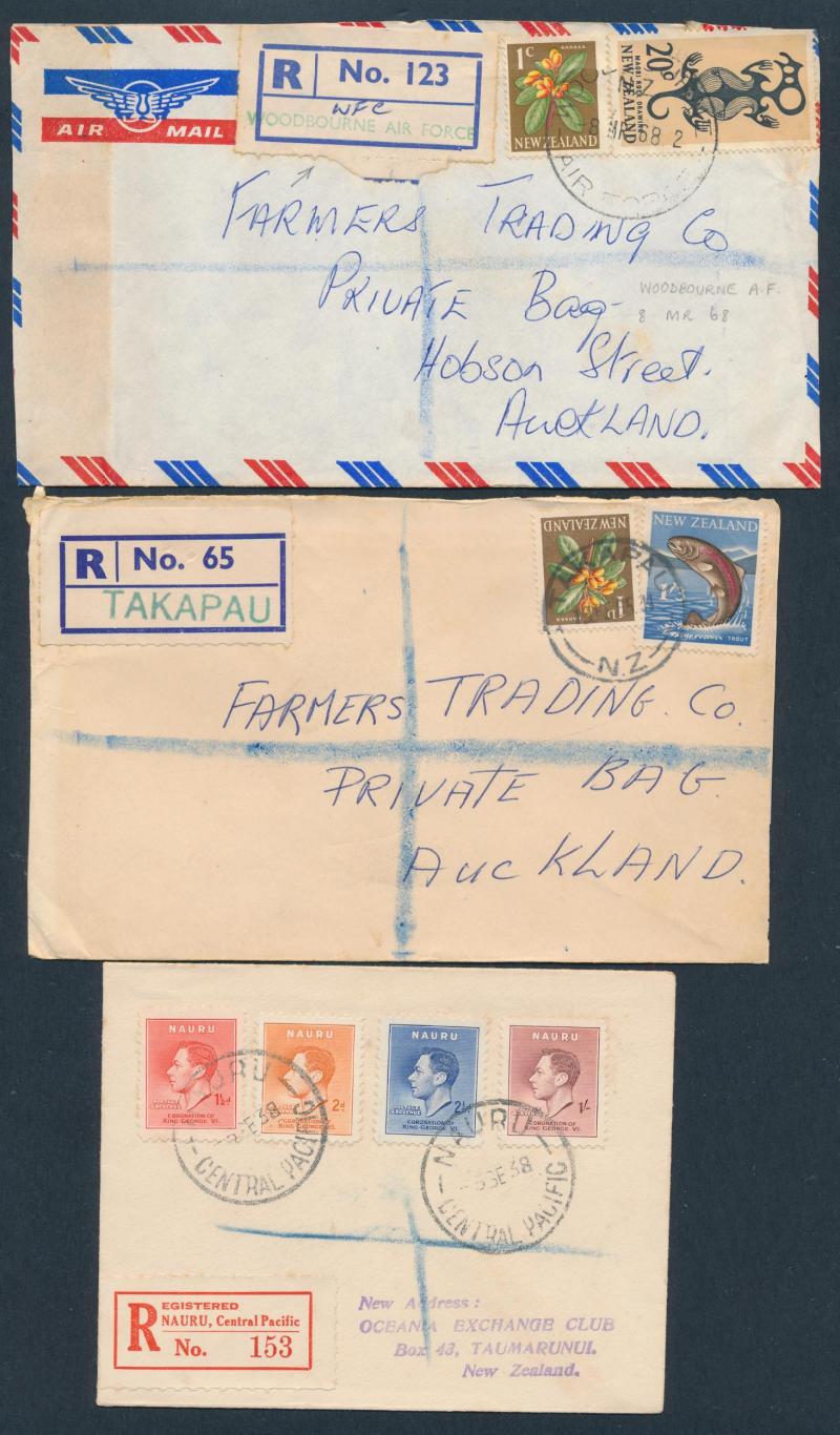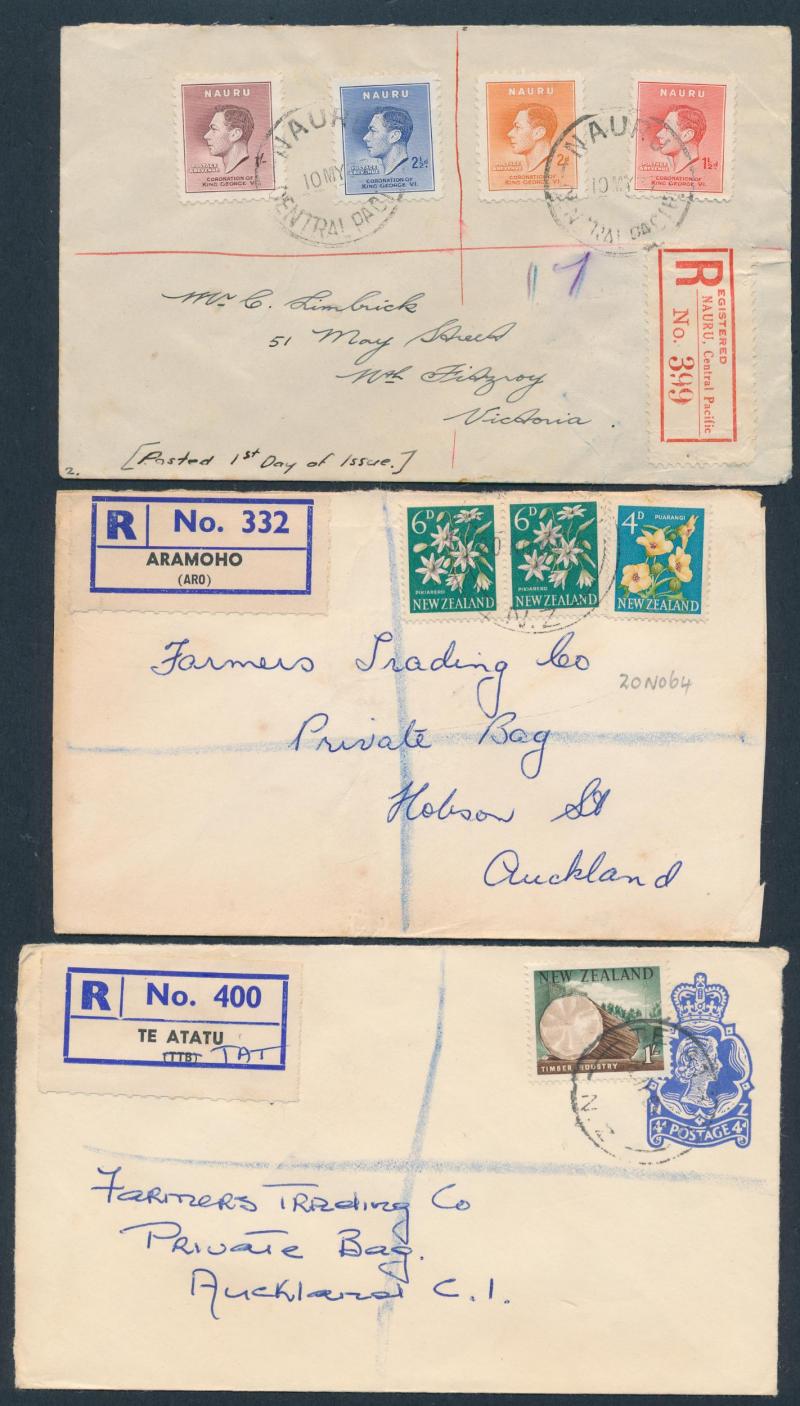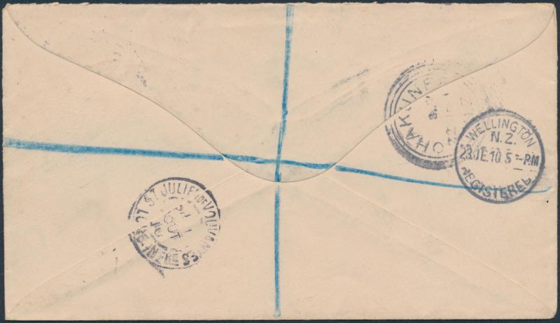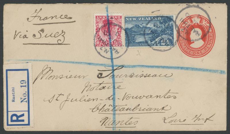 Wakatipu tied by 'RAETIHI' cds cancels with blue/white R label affixed at lower-left, Ohakuna & Wellington transit backstamps and Nantes '1/AOUT/10' arrival alongside, very fine. From 1.1.1901, the universal letter rate was 1d plus 3d registration