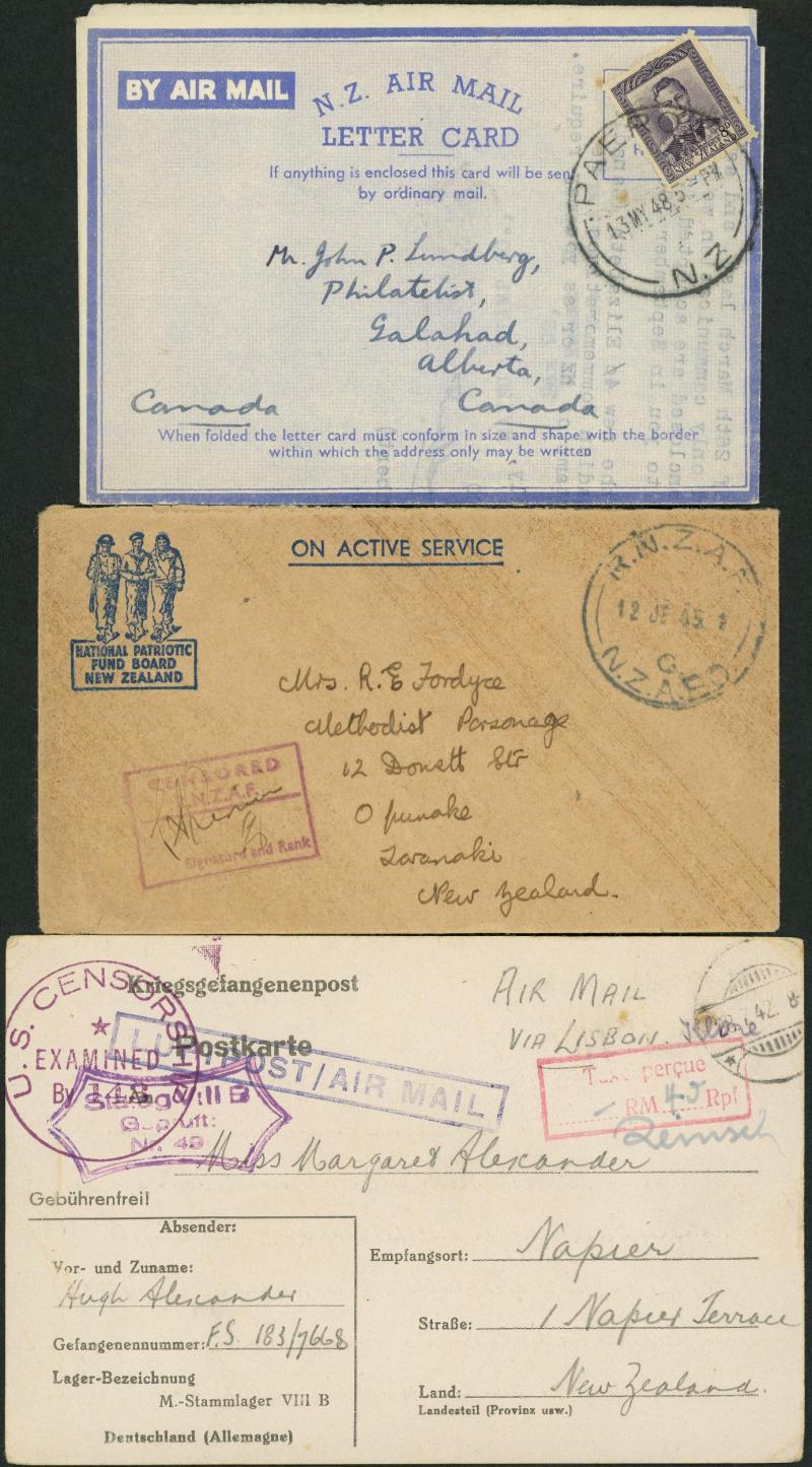 roneo'd 'POSTAL CENSORSHIP/...' insert, Suspended Service covers to France Italy & Sweden, POW Aerogrammes 1/- & 'SIX PENCE' on 1/- both to Germany, formular aerogramme with NZ 6d from a soldier in Italy to a civilian in North Borneo with 'NO