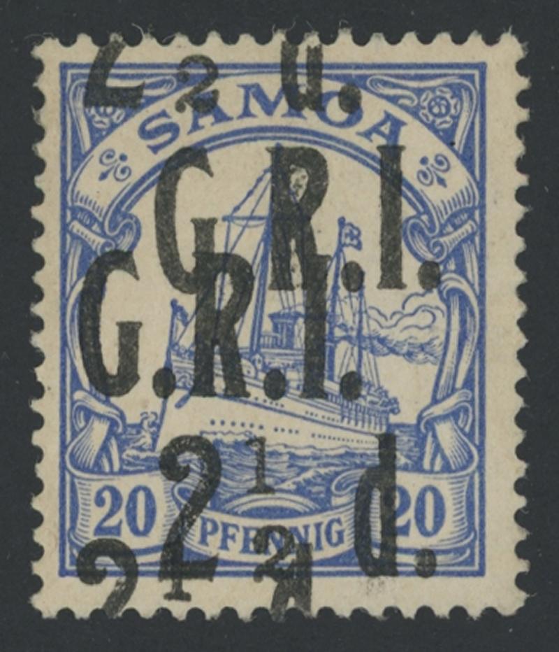 1914 'G.R.I.' Overprints '2½d.' on 20pf blue with Double Overprint and additionally with No Fraction Bar in '½' SG 104ae, Cat