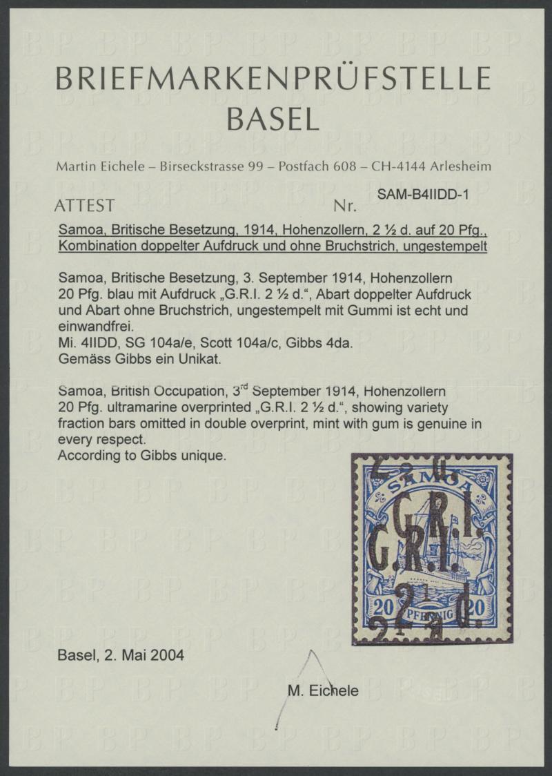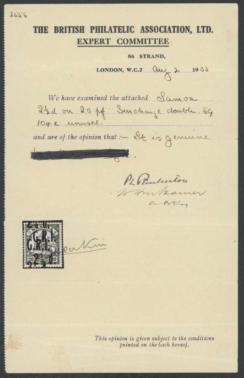 £850+. BPA Certificate (1933) as Double Overprint but not mentioning the omitted fraction bar; Briefmarkenprufstelle Basel Certificate (2004) mentions both varieties and states "According to Gibbs unique". Robert Gibbs at page 267 indicates that only