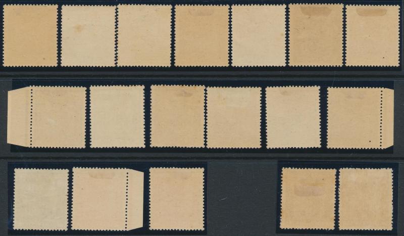lemon x3, 1/3d orange-yellow x2, 4/- red, 5/- green x2 (one marginal; the other apparently **), 7/- blue, 7/6d grey x2, 8/- slate x2 (one marginal), 9/- orange marginal, 10/- carmine-lake & 12/6d plum, plus Wiggins Teape Vertical Mesh Paper 10/- pale