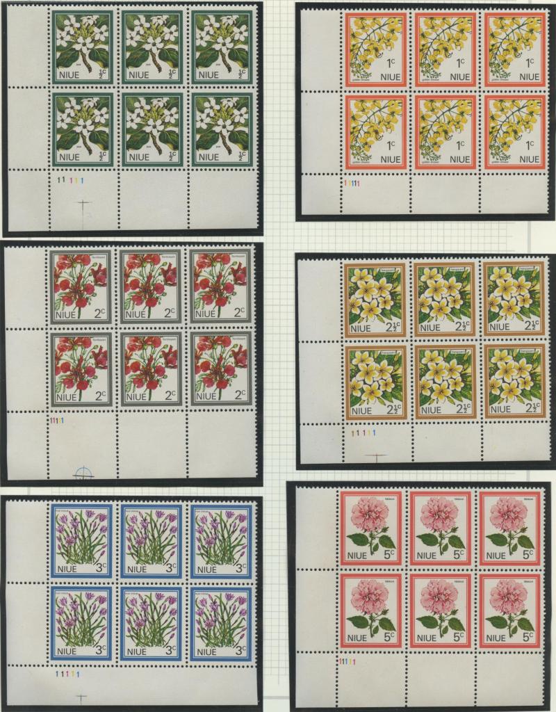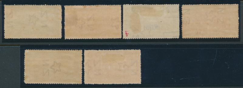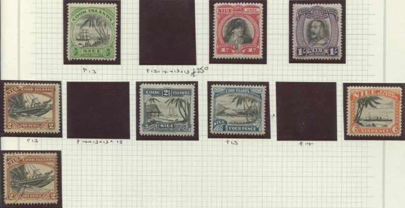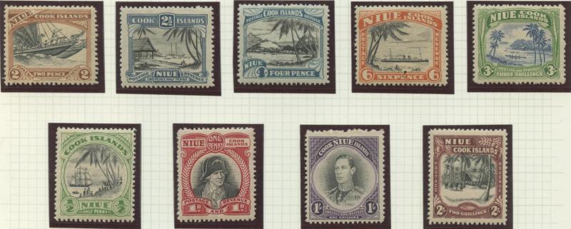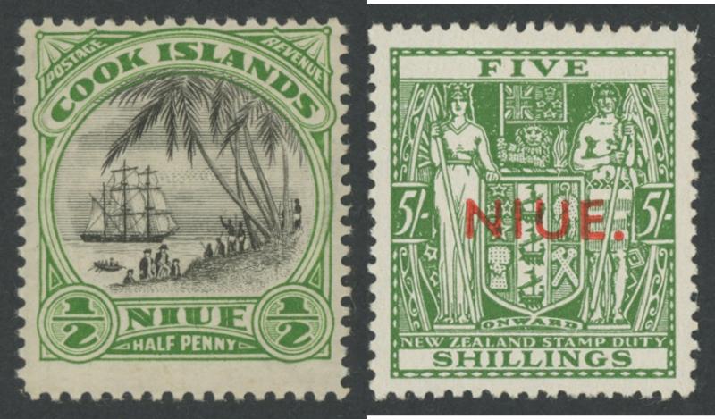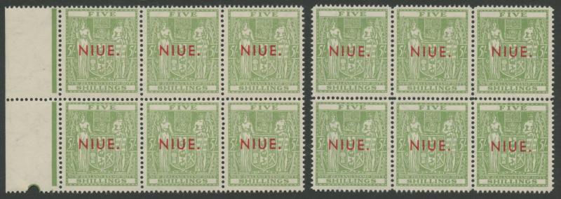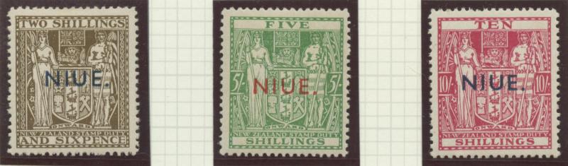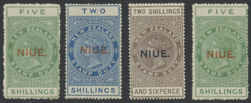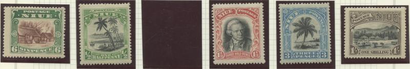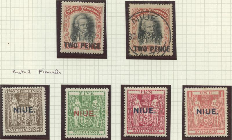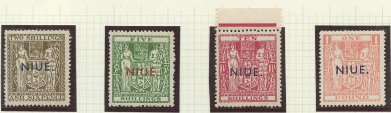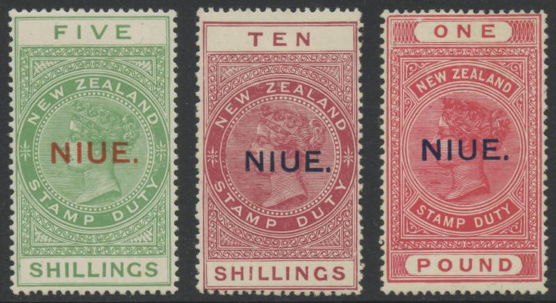 1918-29 'NIUE' Overprint on New Zealand QV Postal Fiscals De La Rue Paper Perf 14 5/- green and Perf 14½x14 2/- to £1 set SG 32-37