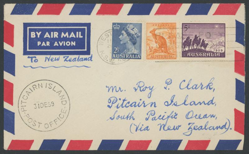 (NSW) machine cancel, to "Mr Roy P Clark, Pitcairn Island, South Pacific Ocean via New Zealand" with superb complete 'PITCAIRN ISLAND/31DE59/POST OFFICE' arrival on the face, a couple of tiny cellotape marks on the reverse hardly detract. The rate