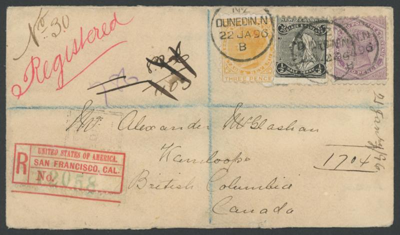 with Canadian Pacific 'C.P. RY M.C.' TPO cds and Kamloops 'MR19/96' arrival alongside, a few very minor blemishes. The rate was 2½d overseas letter plus 3d registration fee. A most attractive usage. (Image1) (Image2)