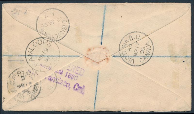cancels, Christchurch transit then carried via the US West Coast with San Francisco 'REGISTERED' handstamp in violet on reverse and red/white Exchange Office R label affixed on the face, Victoria BC [British Columbia] backstamp then carried by train