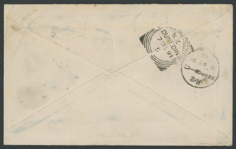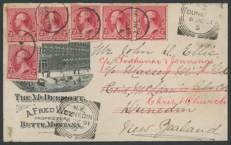 carriages on the street, to Dunedin, New Zealand posted on board ship with Baby Banknotes Washington 2c red x6 tied by New Zealand 'N-Z/MARINE P.O.' framed cds cancels, Dunedin '8 DE 91' Squared Circle arrival cancels on the face where re-directed to