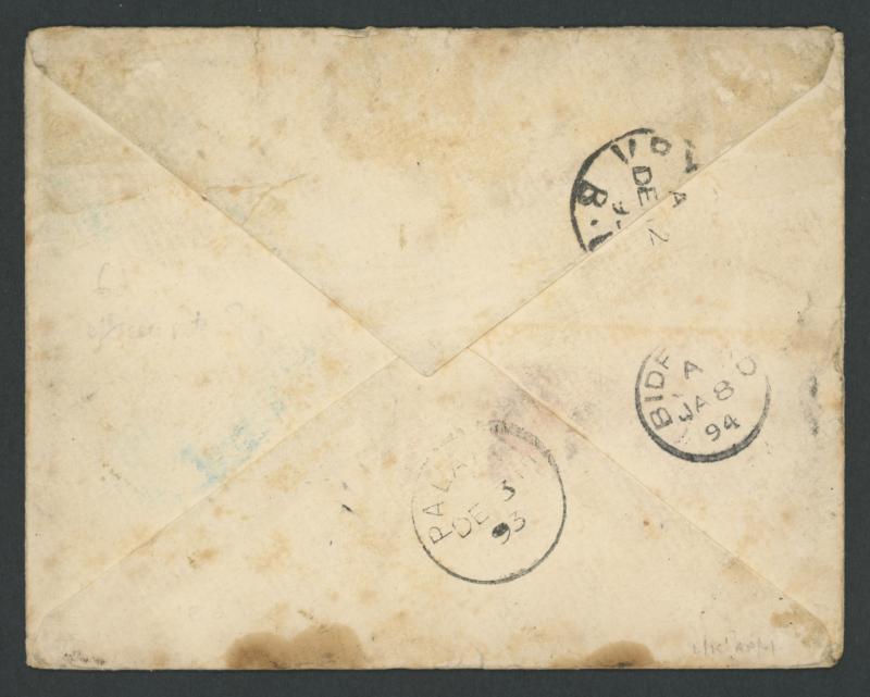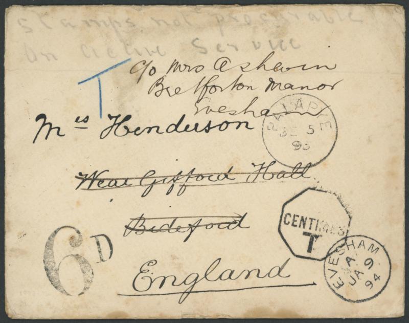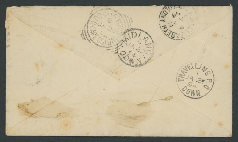 backstamp and another strike of 'DE5/93' on the face, part-'VRY[BURG]/DE12/93/B.[B]' transit backstamp, '6D' and '___/CENTIMES/ T '-in-octagon handstamps of Cape Town (?), 'BIDEFORD/JA8/94' arrival backstamp, forwarded with 'EVESHAM' arrival cds on