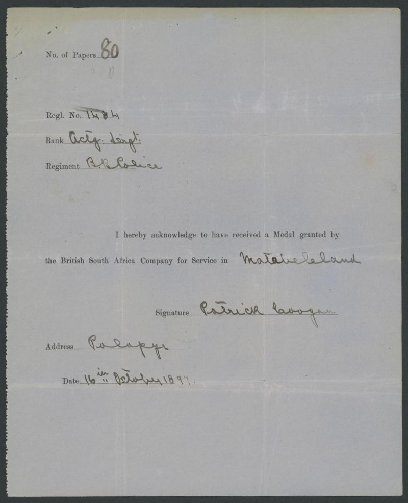 acknowledging having received '...a Medal granted by the British South Africa Company for Service in ["Matabeleland"]', fine 'PALACHWE/KHAMASTOWN' cds & 'GPO/OC24/97/CAPE TOWN' arrival backstamp. The Second Matabele War began in March 1896 and ended