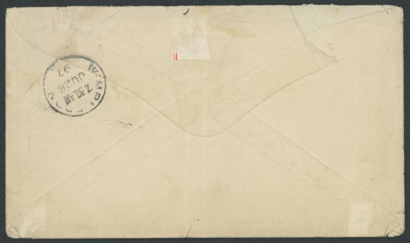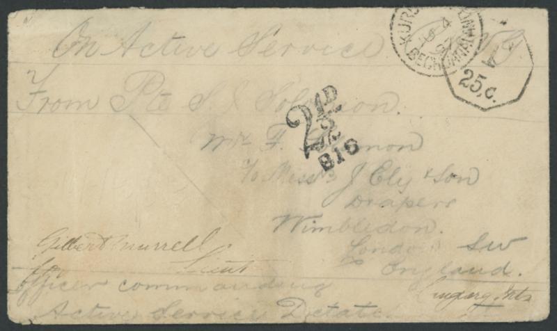 commanding/Active Service Detachment", 'T/25c'-in-octagon of Cape Town & English '2½D/B16' (?) handstamps, 'WIMBLEDON/JU26/97' arrival backstamp, the pencil-writing a bit faded, partly-repaired flap-fault. Scarce mail from a member of the Prince