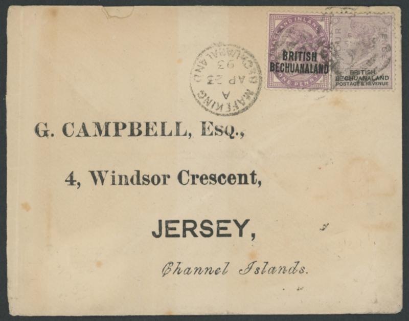 on GB 1d lilac SG 13 & 33 tied by poor '638' cancels with fine 21mm 'MAFEKING/BECHUANALAND' cds alongside, 'VRYBURG' transit & superb 'JERSEY/MY16/93' arrival backstamps, light staining more pronounced on the reverse. (Image1) (Image2)