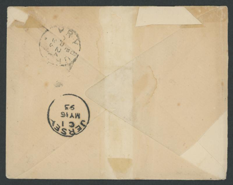 1893 1893 (Apr 23) social double-rate cover to the Channel Islands with unusual franking of Unappropriated Dies 4d plus Overprints